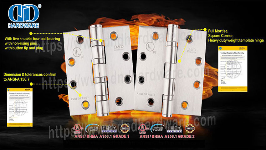 D&D Hardware, un proveedor de herrajes para puertas profesionales, ofrece a distribuidores y fabricantes productos de hardware de primera categoría conocidos por su alta calidad y durabilidad. Nuestra gama de productos, como cerraduras de puertas, bisagras de puertas, barras de puertas antipánico, cilindros de puertas, manijas de puertas, cierrapuertas, etc., han superado con éxito las pruebas ANSI/UL y CE EN.